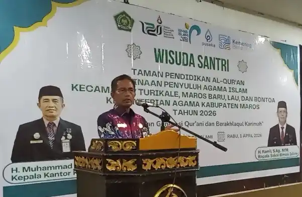 Ghazi.id, Maros — Ratusan santri Taman Pendidikan Al-Qur’an (TPQ) binaan penyuluh agama Islam di Kabupaten Maros mengikuti prosesi wisuda yang berlangsung khidmat di Aula Masjid Al-Markaz Al-Islami, Rabu (1/4/2026). Kegiatan ini melibatkan santri dari empat kecamatan yang dikenal dengan akronim “Tumalabo”, yakni Turikale, Maros Baru, Lau, dan Bontoa.